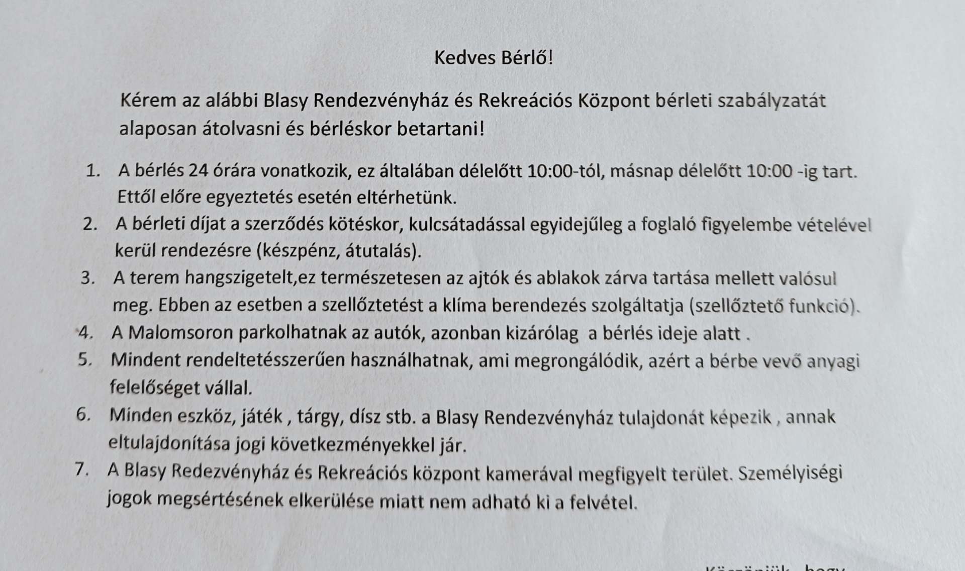 A Blasy Rendezvényház és Rekreációs Központ (továbbiakban: Helyszín) a Házirendben foglaltak alapján biztosítani kívánja a vendégek (továbbiakban: Ügyfél) kulturált, szórakozását, biztonságát, illetve az épület berendezéseinek, felszereléseinek kellő megóvását.
